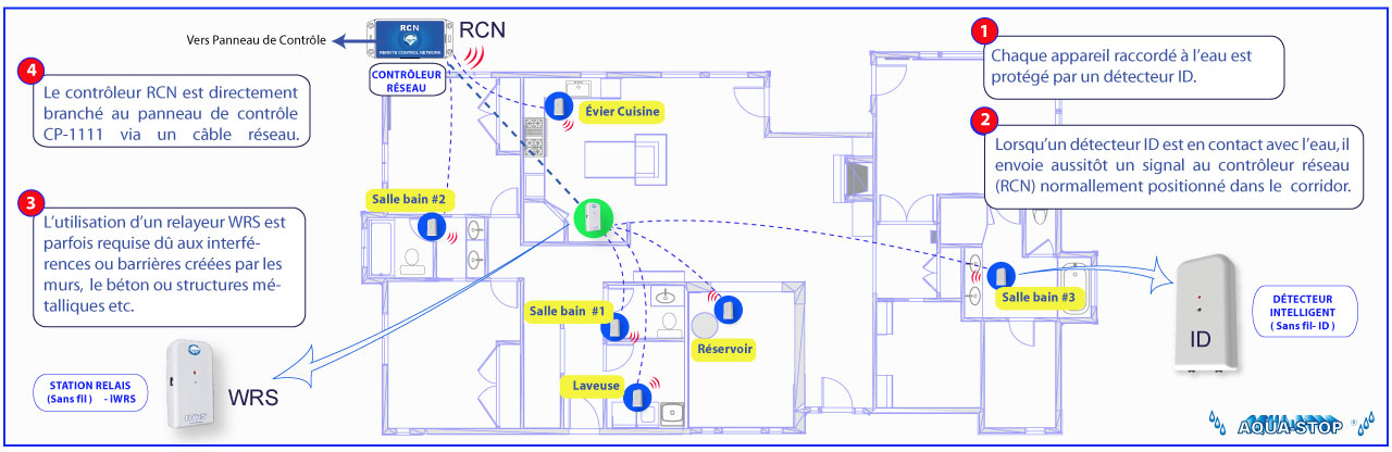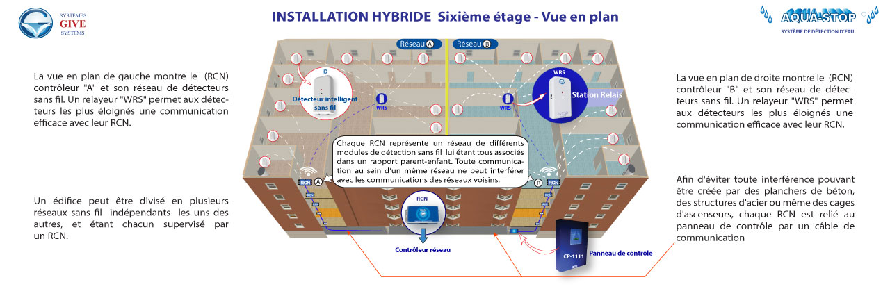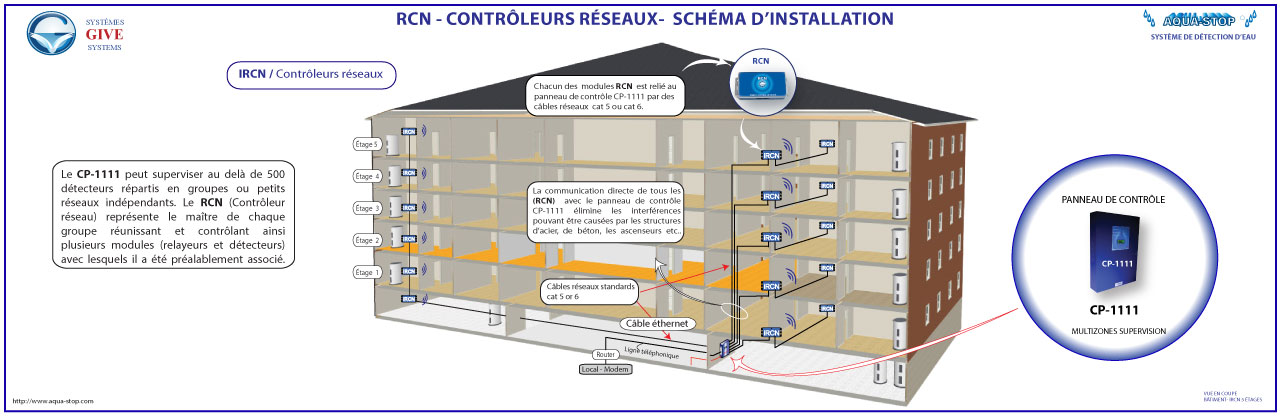 La supervision globale d'un édifice est assurée par un groupe de réseaux indépendants formés par des détecteurs sans fil (ID), des relayeurs (WRS) et des contrôleurs (RCN). Chaque groupe de détecteurs ID est associé avec son contrôleur RCN respectif. Les relayeurs (WRS) peuvent être ajoutés au besoin. Tous les contrôleurs RCN sont branchés par câble réseau directement au panneau de contrôle CP-1111.