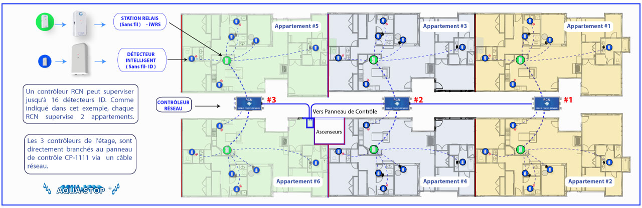 Les 6 appartements illustrés plus haut sont supervisés par 3 contrôleurs RCN, à raison de 2 appartements par contrôleur. Les appartements 1 & 2 sont supervisés par le RCN #1, les appartements 3 & 4 par le RCN #2 et les appartements 5 & 6 par le RCN #3. Les 3 RCN (contrôleurs) de cet étage sont tous branchés sur le même câble réseau (BUS). Ce câble, à son tour , est branché directement au panneau de contrôle CP-1111.
